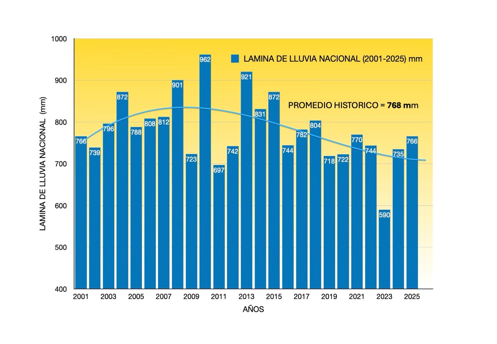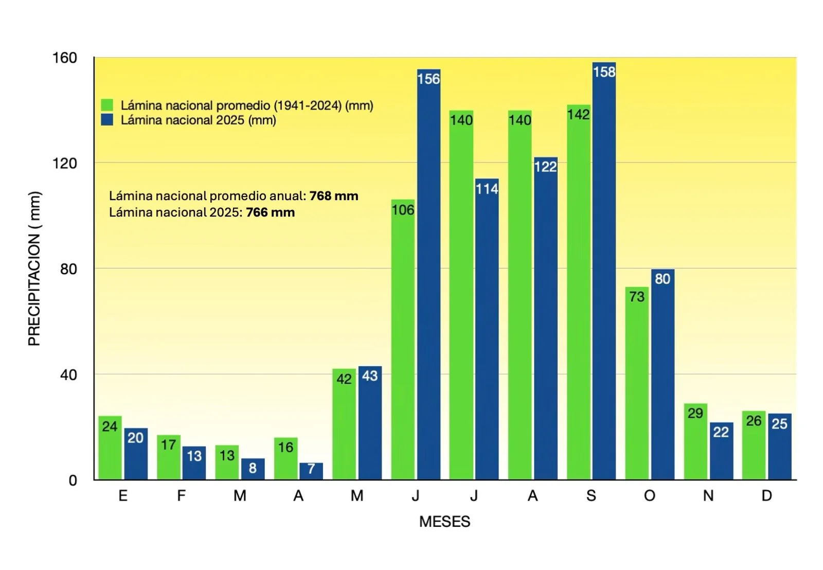1. La lámina promedio anual de lluvia en 2025 fue de 766 mm, prácticamente igual que el promedio histórico de 768 mm. Si se considera solamente el periodo de junio a octubre la precipitación en 2025 fue de 630 mm contra el promedio histórico de 601 mm. Es decir, un buen año para la agricultura de temporal.