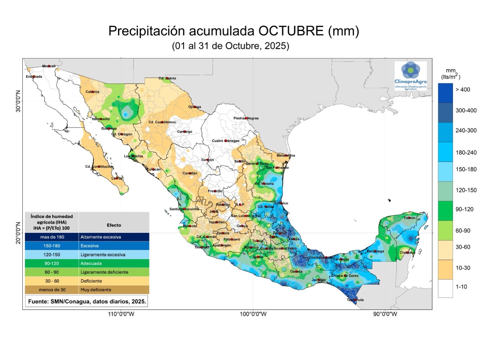 Las lluvias más importantes se observaron en las regiones del Golfo de México, la península de Yucatán, la región Sureste y áreas puntuales del Altiplano Central, Nayarit, Sonora y Sinaloa, con totales arriba de 150 mm. La producción agrícola de cultivos de temporal en su etapa final requiere poca agua. De manera que cantidades de lluvia entre 30 y 90 mm en octubre ayudan a completar el ciclo de cultivos como maíz, frijol, avena, cebada y otros. Sin embargo, áreas agrícolas de Guanajuato, Jalisco, Aguascalientes, Zacatecas, Durango, y Chihuahua, con lluvia debajo de 30 mm tuvieron escasez de agua al final del ciclo de cultivo.