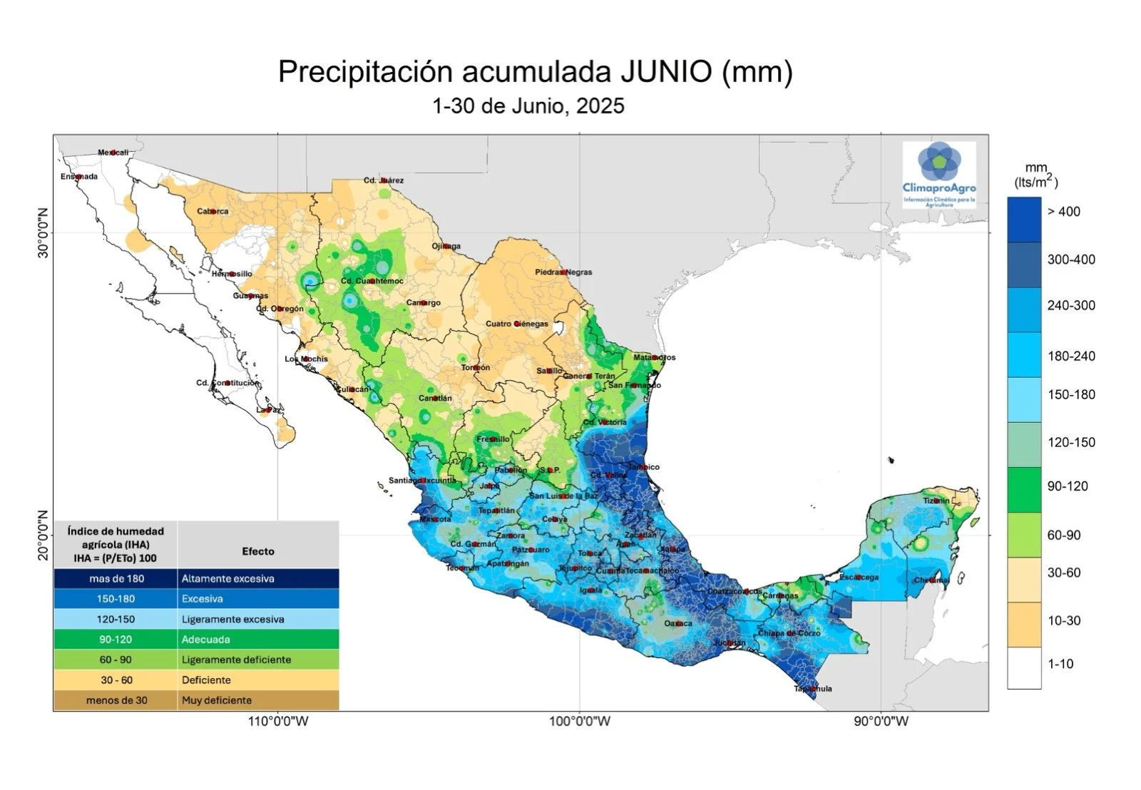 El temporal de lluvias en 2025 inició temprano con lluvias importantes para la agricultura en áreas de las regiones Sureste, Golfo de México y Altiplano Central. El temporal de lluvias prácticamente se generalizó en junio en todo el país y favoreció las siembras tempranas de cultivos de temporal. Las lluvias de junio (ver mapa anexo), fueron abundantes (47 % arriba del promedio histórico) en varias regiones, sobre todo en La Huasteca, sur de Veracruz y varias partes de la región sureste del país, donde las lluvias de junio alcanzaron totales acumulados arriba de 300-400 mm.
