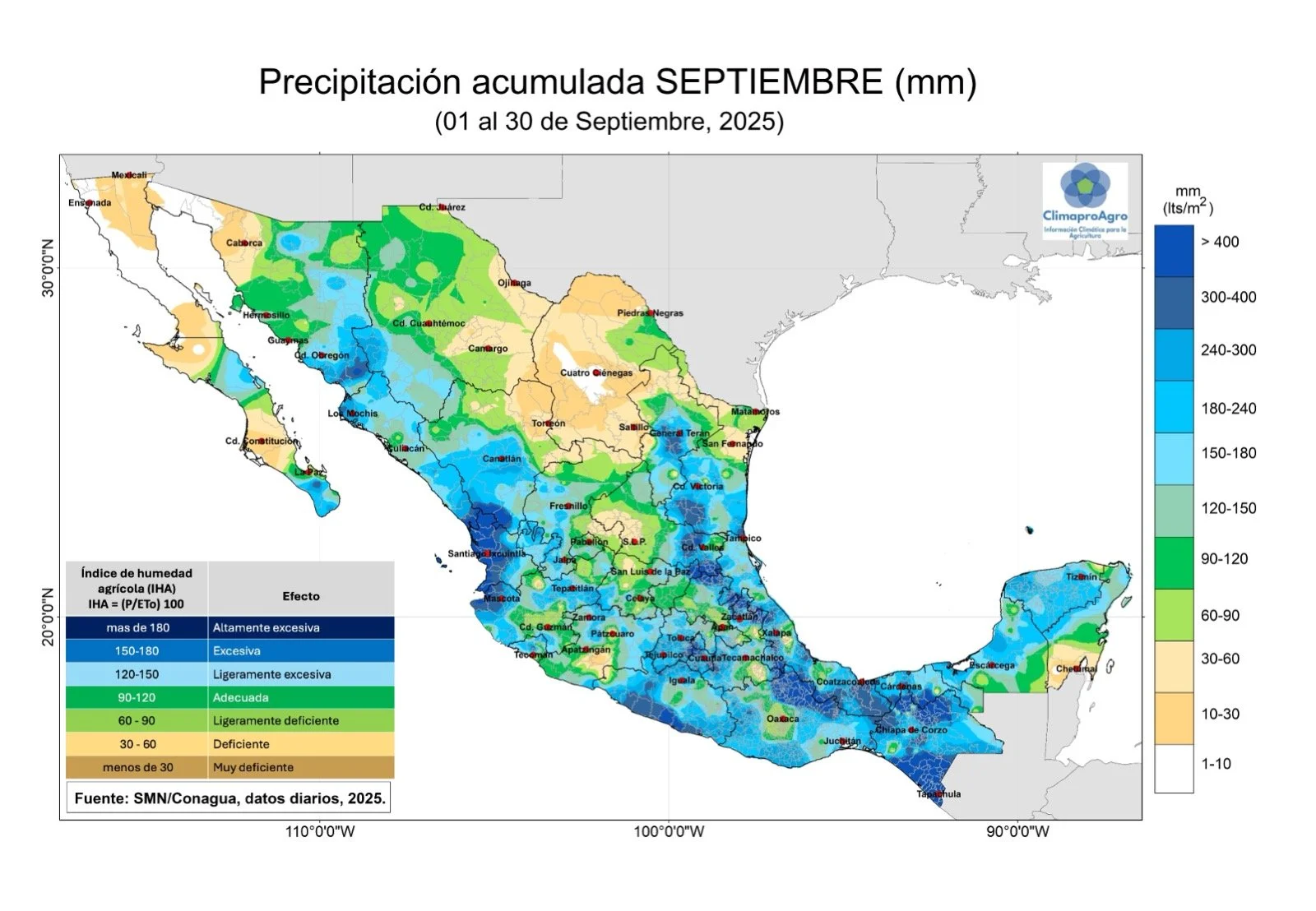 De acuerdo con las estadísticas del Servicio Meteorológico Nacional septiembre es el mes más lluvioso con una lámina promedio de lluvia de 142 mm. En 2025 no fue la excepción, la lámina registrada fue de 158 mm (11% arriba del promedio). Se registraron lluvias importantes (ver mapa anexo) en zonas de Baja California Sur, Sonora, Sinaloa, Durango, Zacatecas y sobre todo Nayarit. Las lluvias de septiembre también favorecieron la región Occidente, Altiplano Central, Noreste, Sureste y Golfo.