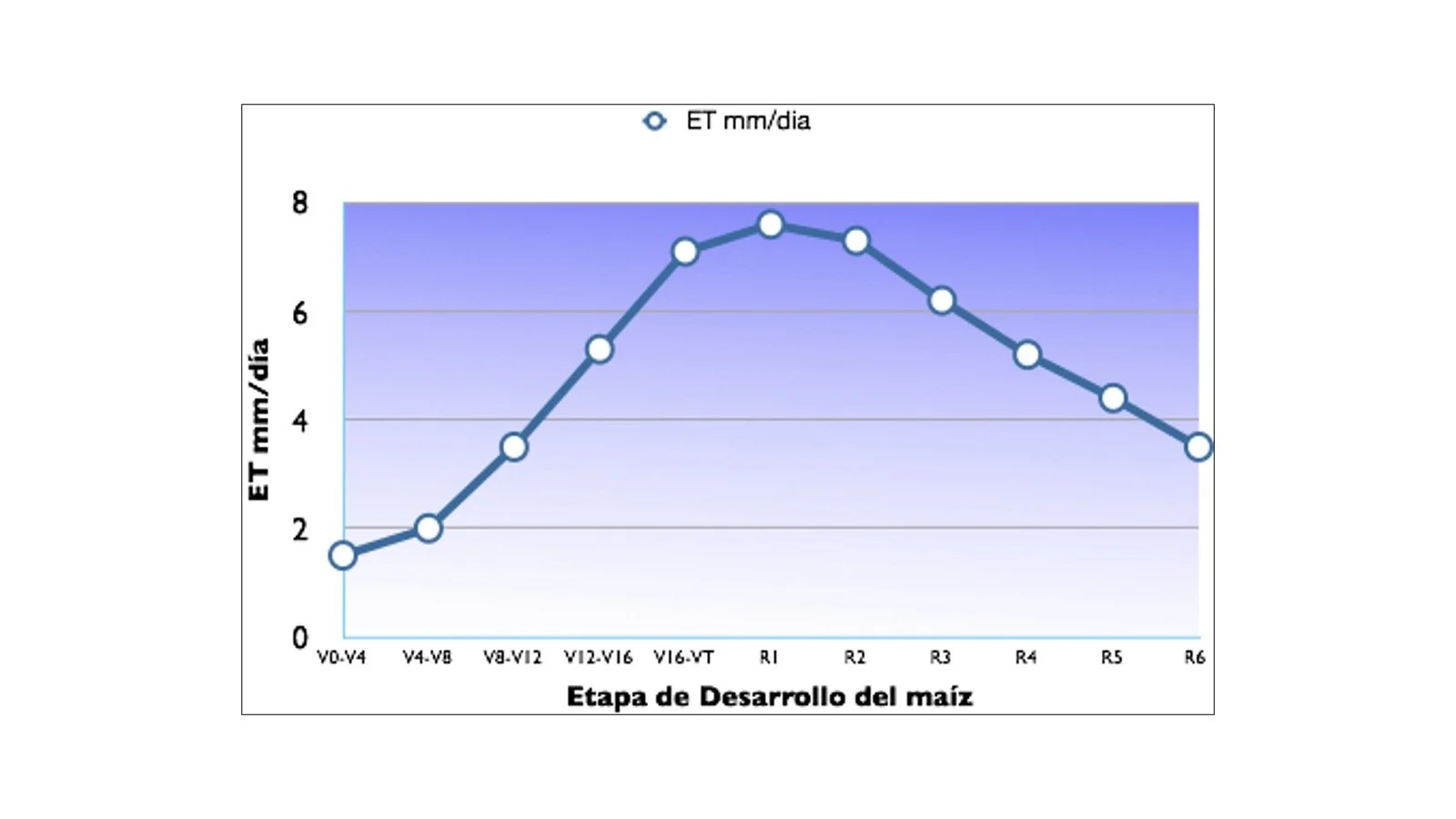 Además, los requerimientos de agua del maíz varían según su etapa de desarrollo. En las primeras etapas de desarrollo (Etapas V0 a V15) el consumo de agua es menor y se va incrementando hasta alcanzar el máximo en las etapas de pre-floración, floración y llenado del grano (etapas V16-R3). Luego va descendiendo hasta llegar a la madurez fisiológica (etapa R6) donde el cultivo no necesita más agua (ver gráfica adjunta).