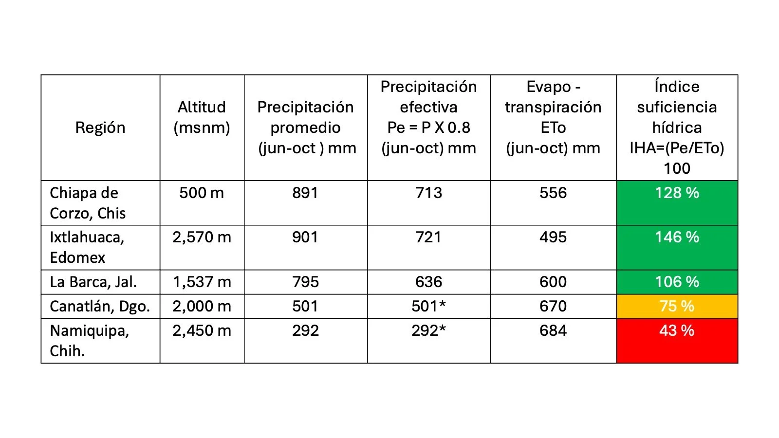 Para ilustrar la forma de determinar de manera preliminar, la capacidad de una región o localidad para producir una buena cosecha de maíz, se usará un método práctico que utiliza los datos promedio de precipitación y de evapotranspiración del periodo de junio a octubre. Las localidades seleccionadas están ubicadas en regiones con clima muy diferente entre ellas: Chiapa de Corzo, Chiapas, Ixtlahuaca, Edomex, La Barca, Jal, Canatlán, Dgo., y Namiquipa, Chih. La tabla adjunta presenta las características de precipitación, de precipitación efectiva, de evapotranspiración y del índice de suficiencia de humedad agrícola, en todos los casos para el periodo de junio a octubre que es cuando se desarrolla el ciclo del maíz de temporal.