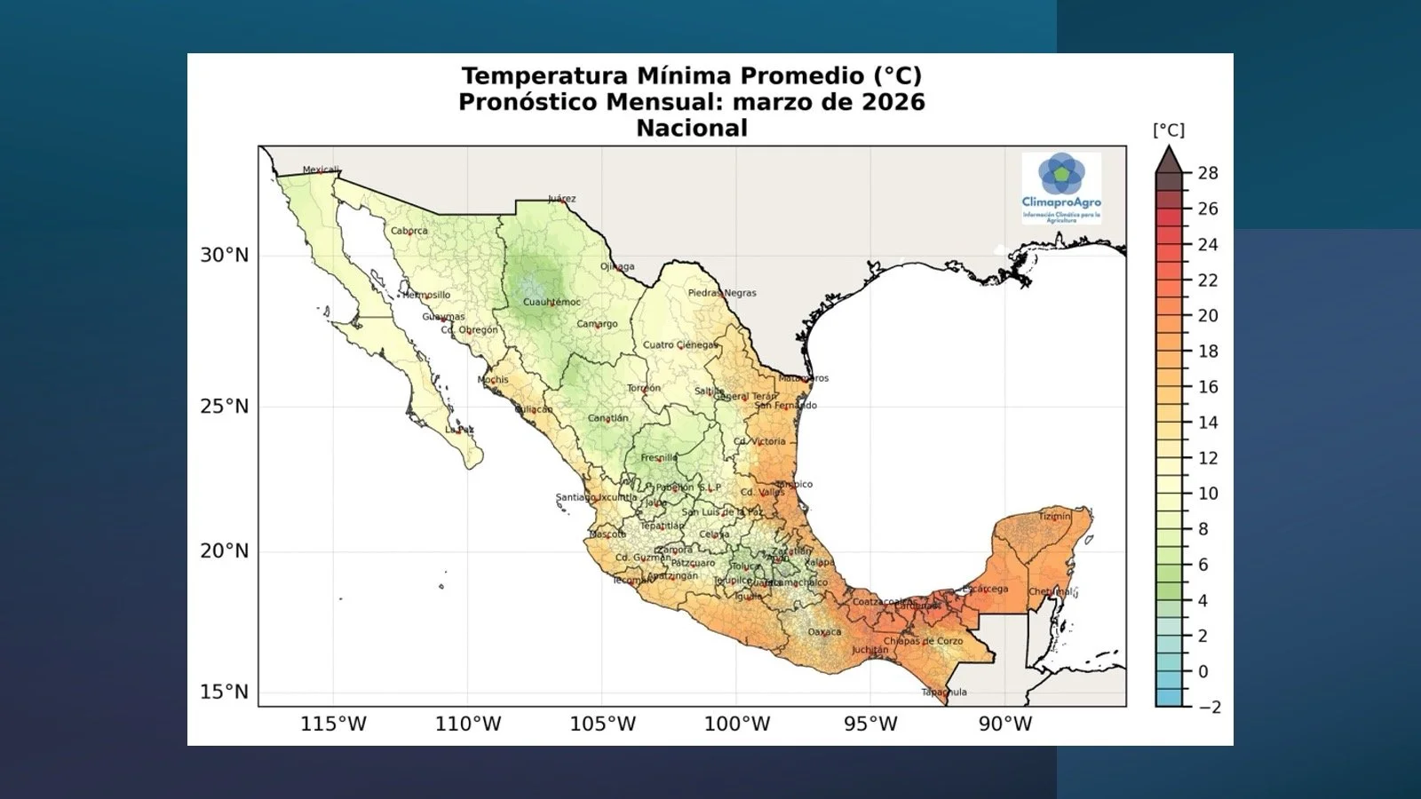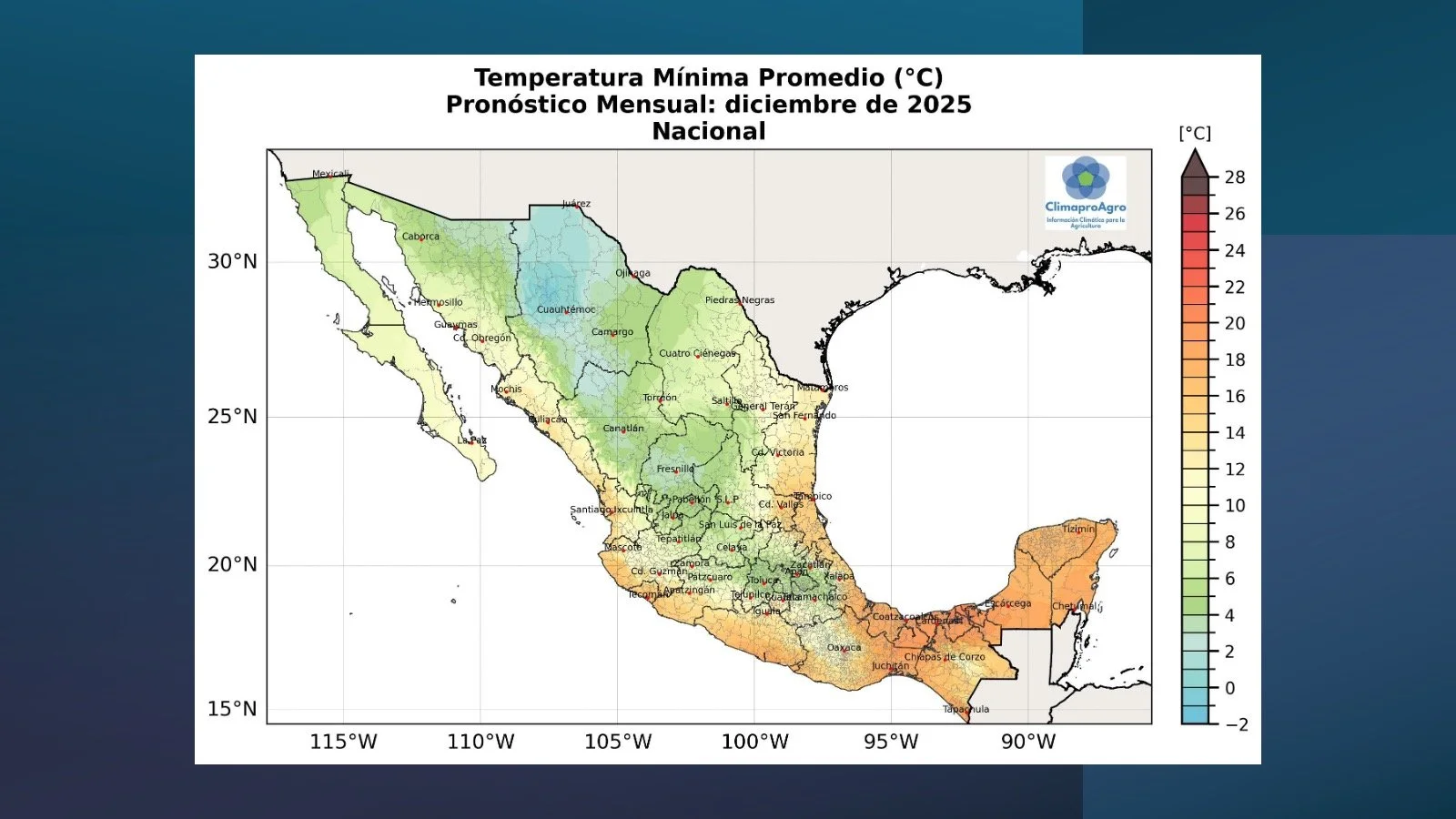 En este artículo se presenta: 1) la situación climática de El Niño/La Niña y su efecto en la temperatura mínima en México; 2) el pronóstico de temperatura mínima de los meses de diciembre 2025 a marzo 2026 y su impacto en la agricultura en cultivos y regiones específicas de México, en particular en el trigo de invierno y los frutales de clima frio.