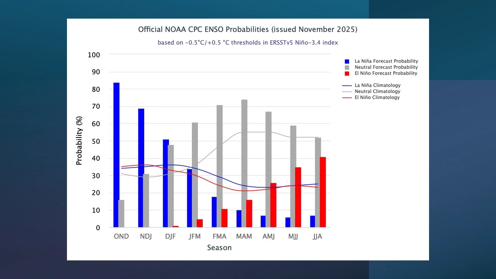 Situación de El Niño/La Niña al mes de noviembre de 2025 y su evolución en los próximos meses.