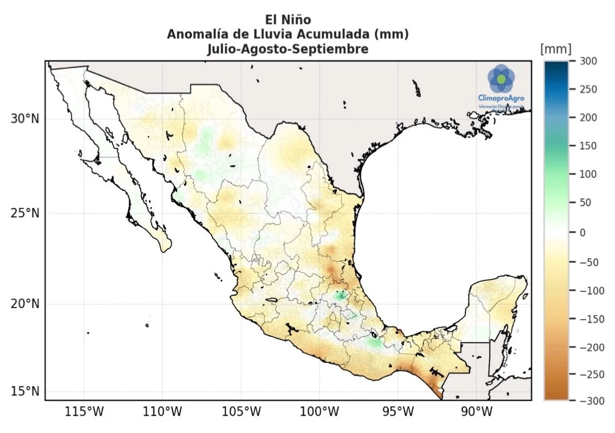 Los eventos climáticos de El Niño o de La Niña son temas que el sector agrícola relaciona frecuentemente con una variación importante del clima y muchas veces se asocian con la ausencia prolongada de lluvia y el desarrollo de sequías, las cuales pueden tener un fuerte impacto en la agricultura. Los eventos de El Niño ocurridos en 1982-1983 y de 1997-1998, por ejemplo, tuvieron un gran impacto económico en la agricultura de México, con la reducción de las lluvias y el desarrollo de sequía que afectaron fuertemente la agricultura, la ganadería y el área forestal. Sin embargo, la gran sequía ocurrida en los años 2011-2012 no estuvo asociada con la presencia de El Niño y si un poco con la presencia de La Niña. Asimismo, otros eventos de El Niño, como el de 2015-2016 no redujo las lluvias de manera significativa en México.
