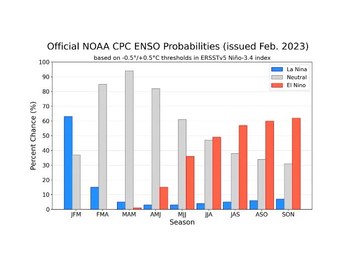 De acuerdo con información de centros internacionales de monitoreo y pronóstico del clima, se prevé la presencia de un evento de El Niño en el segundo semestre de 2023, con una probabilidad de ocurrencia arriba del 50% a partir del mes de julio (ver gráfica).