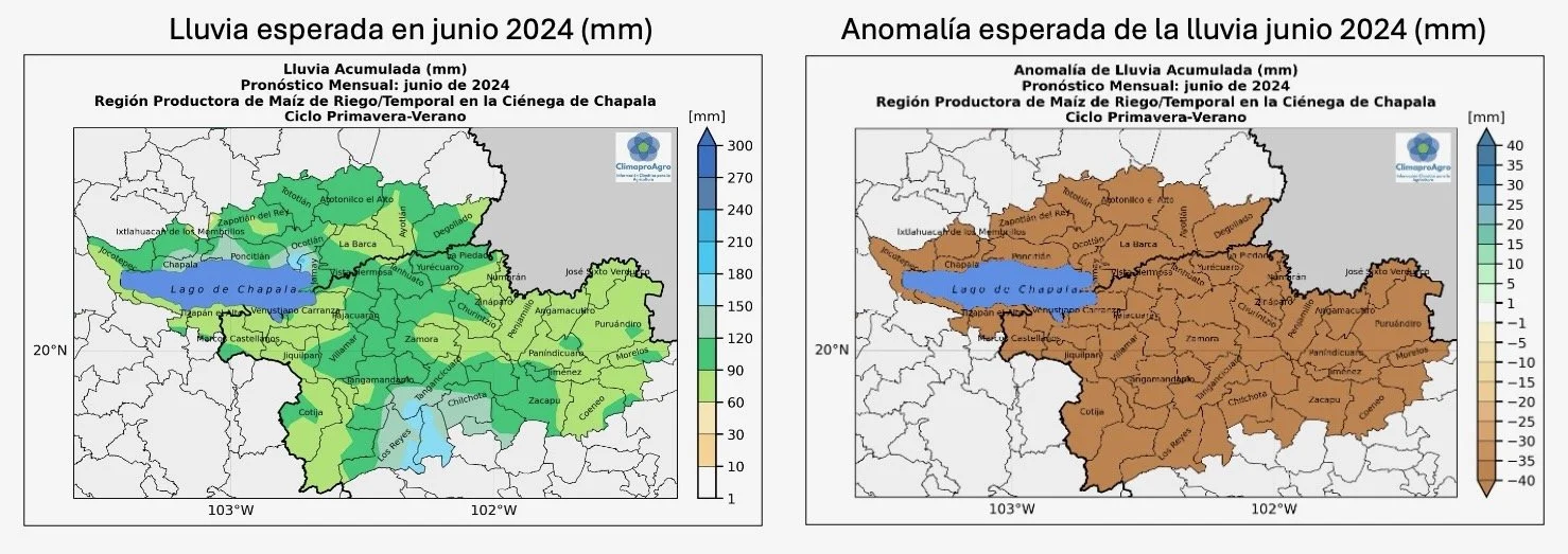 Tomemos como ejemplo de ilustración, el pronóstico de lluvia del mes de junio de 2024 para la región productora de maíz de la Ciénega de Chapala, la cual incluye parte de los Estados de Jalisco y Michoacán (ver mapas de pronóstico). El pronóstico de lluvia indica una anomalía negativa, es decir, una disminución de la lluvia de aproximadamente 40 mm por debajo del promedio histórico para esa región.