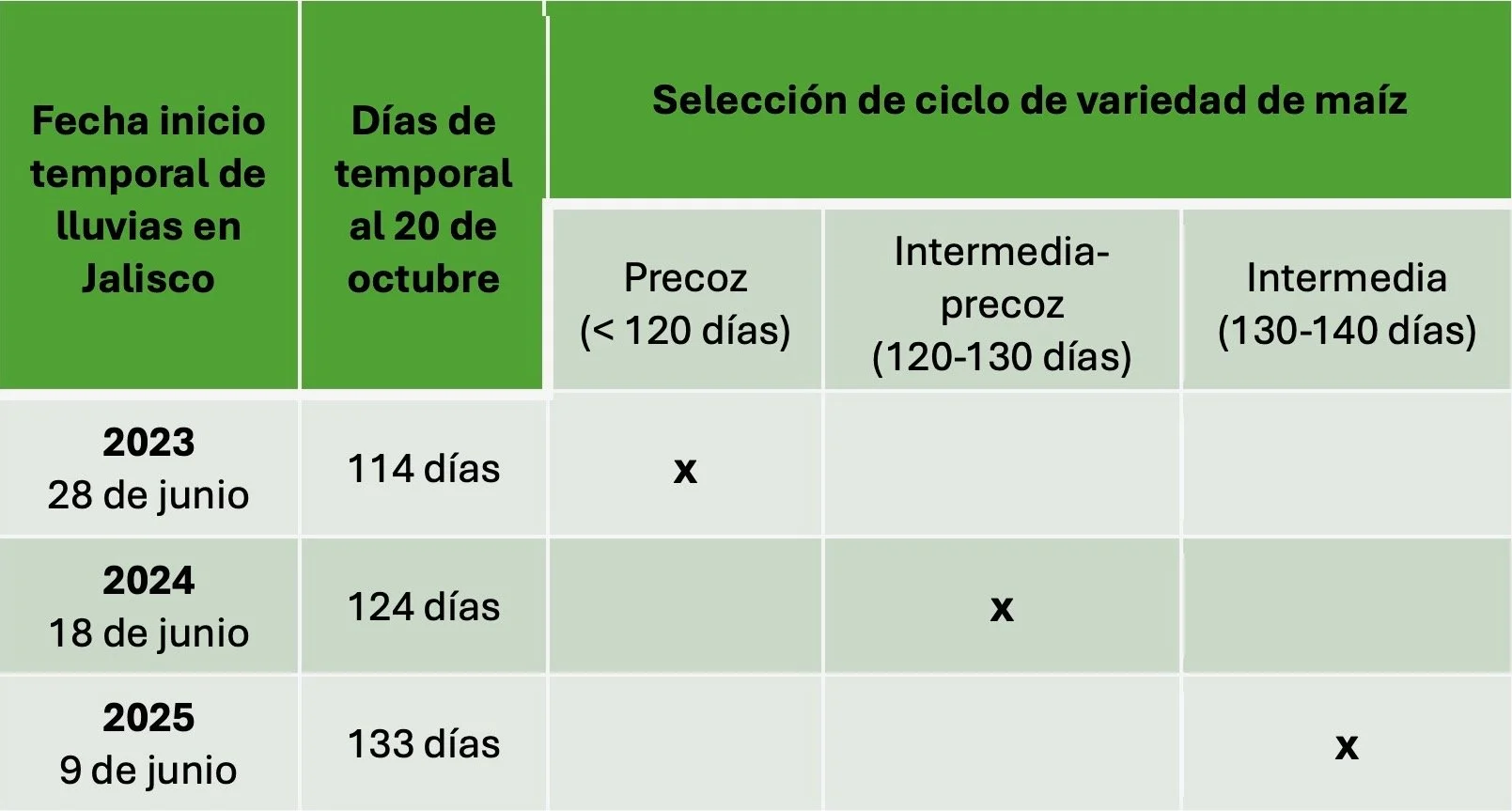 ¿Pero qué nos indica la fecha del inicio del temporal de lluvias para seleccionar una variedad de maíz apropiada? Bien, pronósticos de lluvia en junio arriba del promedio y con un inicio temprano del temporal como en 2025, indican que es una buena opción para la siembra de una variedad de maíz de ciclo intermedio (entre 130 -140 días a madurez). En cambio, pronósticos de lluvia en junio muy por debajo del promedio y un inicio del temporal como en 2023, indican que la opción más adecuada, dado el inicio del temporal muy tarde, es la siembra de una variedad de ciclo corto (inferior a 120 días a madurez). Para más detalles, ver Tabla 1. El cálculo de la duración del temporal de lluvias se consideró, por los estudios climáticos que hemos realizado, que termina a más tardar el 20 de octubre. Así, por ejemplo, la duración del temporal del 28 de junio al 20 de octubre es de 114 días solamente.