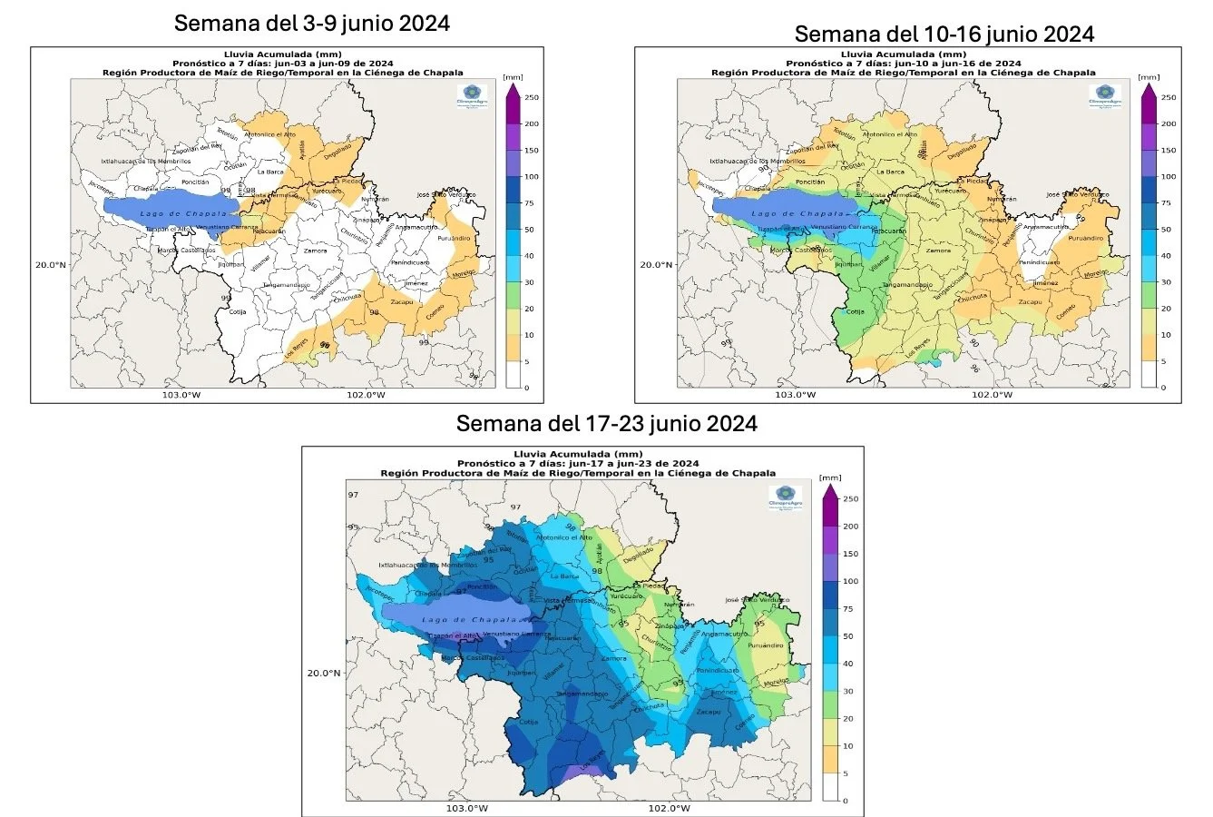 Para identificar la mejor fecha de siembra, utilizaremos los pronósticos de lluvia semanales para la misma región de la Ciénega de Chapala, para las semanas del 3-9 de junio, 10-16 de junio y 17-23 de junio de 2024 (ver mapas de pronósticos).